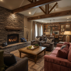 Historic Niagara-on-the-Lake Homes: Emphasize stone fireplaces, deep wine reds, and trellis-style millwork.